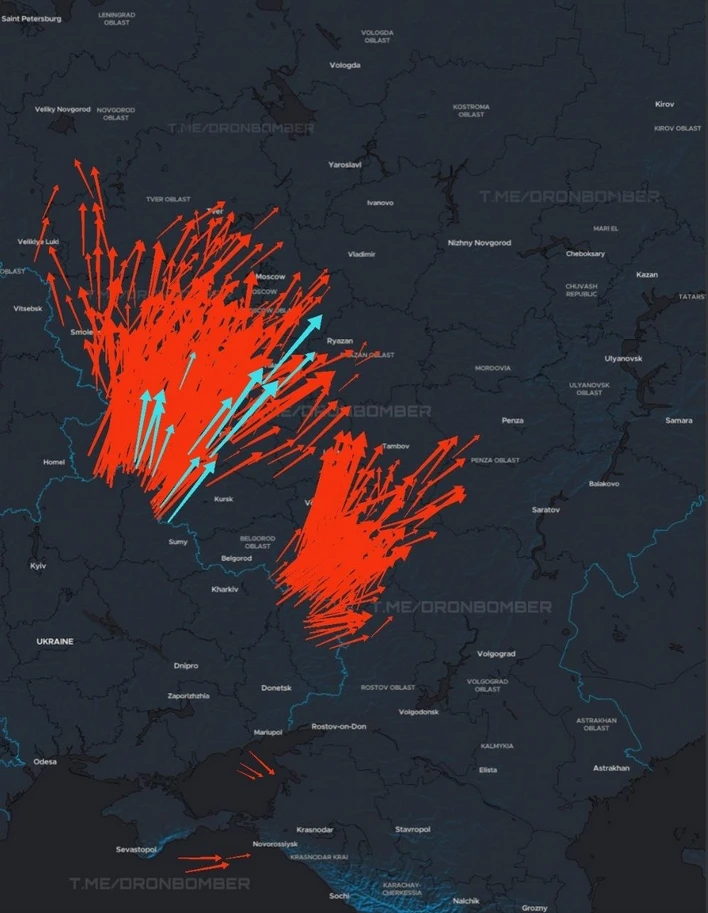 Так в ночь на 11 декабря выглядела карта приблизительных маршрутов налета украинских беспилотников на территорию России. Красные стрелочки обозначают ударные беспилотники, синими обозначены реактивные БПЛА.