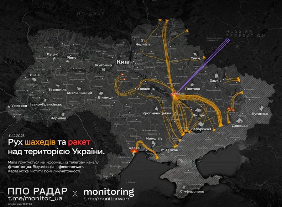 В ночь на 11 декабря российские оккупанты нанесли комбинированный удар по объектам критической инфраструктуры Украины с применением ударных БПЛА и ракет наземного базирования, сообщили в командовании Воздушных сил.